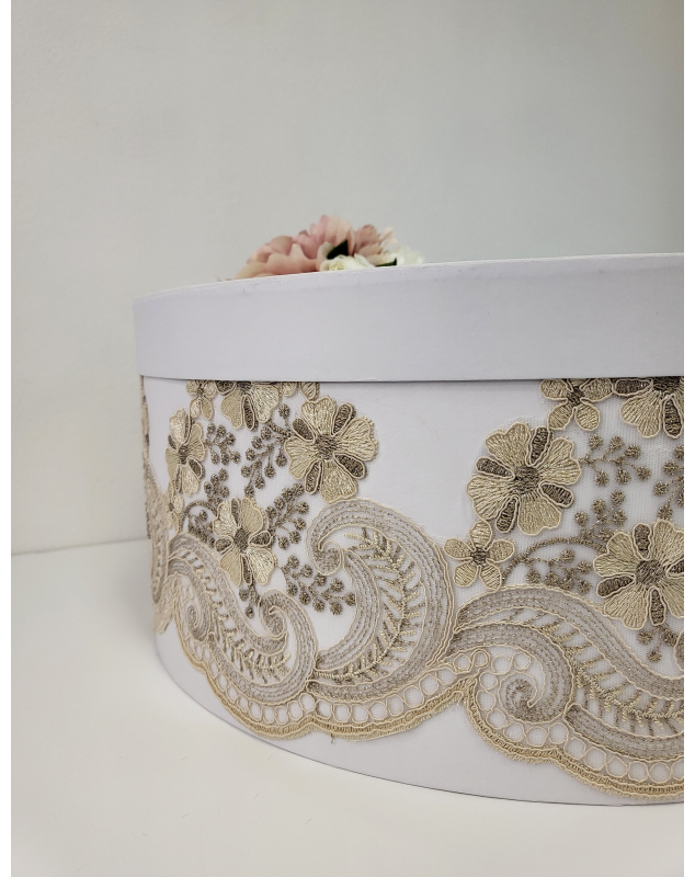 Νυφική λευκή καπελιέρα με δαντέλα ιβουάρ-άμμου-χρυσό στο κάτω μέρος,
