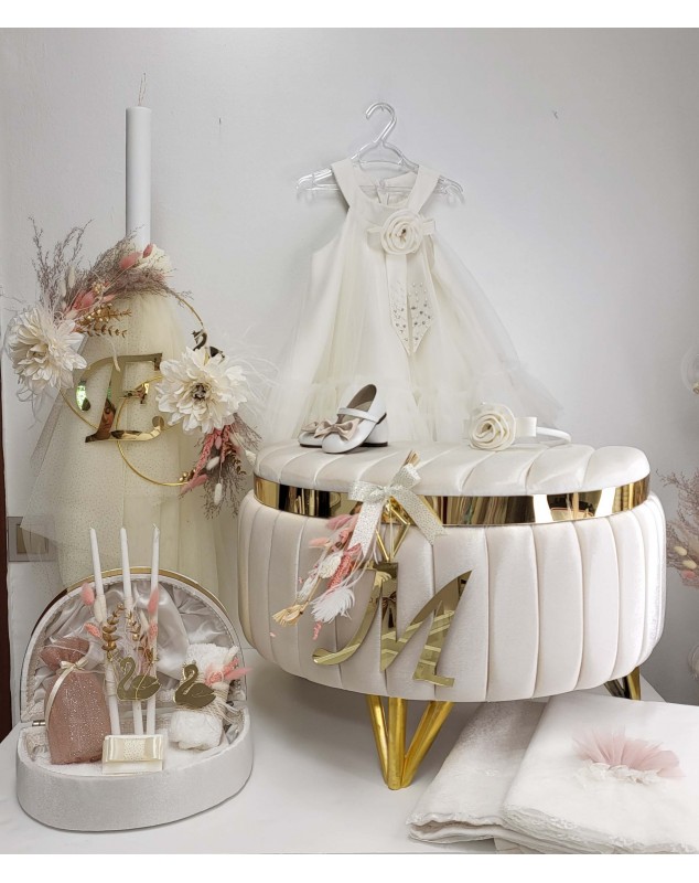 Λαδοσέτ (Μπουκαλάκι λαδιού, πετσέτα χεριών για τον ιερέα, 3 μικρά κεράκια κολυμπήθρας και σαπουνάκι.)