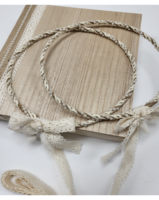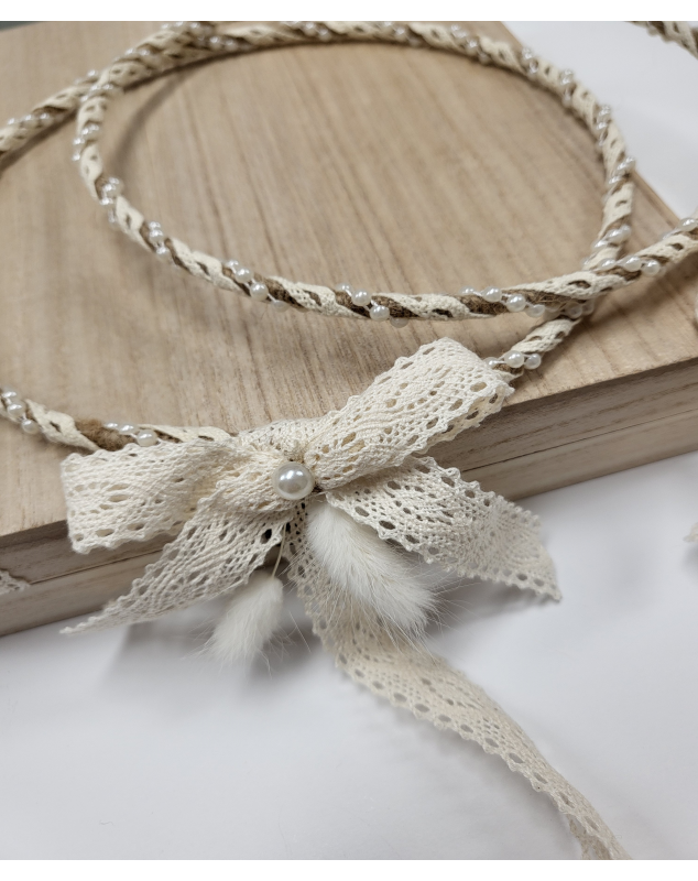 τα αγκαλιάζει βαμβακερή κορδέλα σε ιβουάρ απόχρωση και λεπτή περλίτσα,