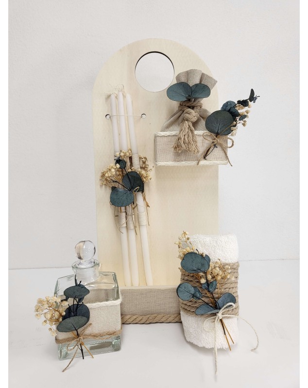 Λαδοσέτ (Μπουκαλάκι λαδιού, πετσέτα χεριών για τον ιερέα, 3 μικρά κεράκια κολυμπήθρας και σαπουνάκι.)